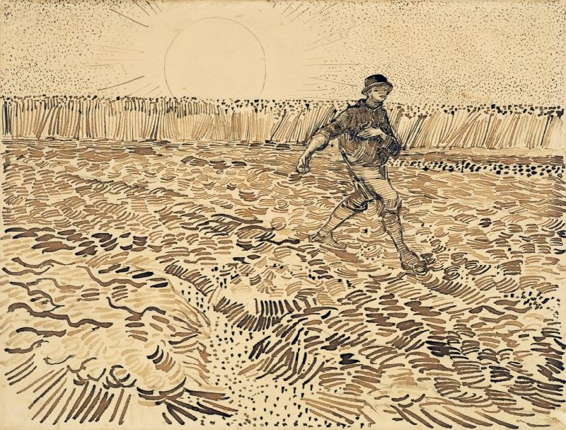 Deze tekening maakte Van Gogh naar een van zijn eigen schilderijen: De zaaier, die nu in het Kröller-Müller Museum hangt. In totaal maakte hij meer dan dertig tekeningen en schilderijen met dit thema. De zaaier stond symbool voor de eeuwige cyclus van het bestaan. Wie zaait, brengt nieuw leven voort.