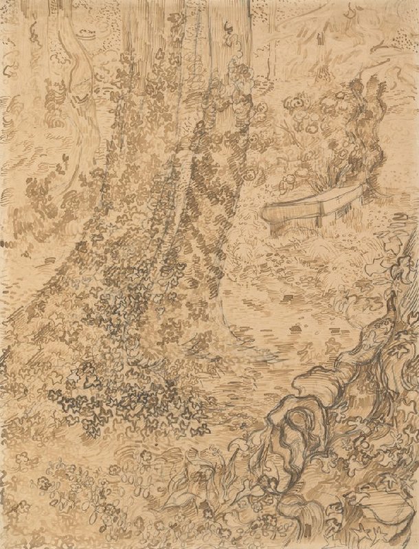 Deze tekening maakte Vincent voor zijn broer Theo. Het onderwerp was ‘alledaags’ als een goedkoop kleurenprentje, schreef hij. Een bankje bij een rozenstruik onder de bomen, als van die ‘eeuwige nestjes in het groen voor verliefden’. Maar hij liet het daar niet bij, hij had er ‘stijl’ in gebracht, zoals hij zelf zei. Daarmee bedoelde hij dat hij door zijn manier van schilderen boven het banale onderwerp was uitgestegen.