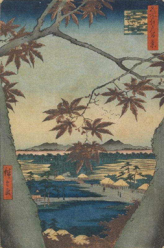 De esdoorns in Mama, de schrijn van Tekona en de Tsugi brug, uit de prentenserie Honderd gezichten op beroemde plaatsen in Edo