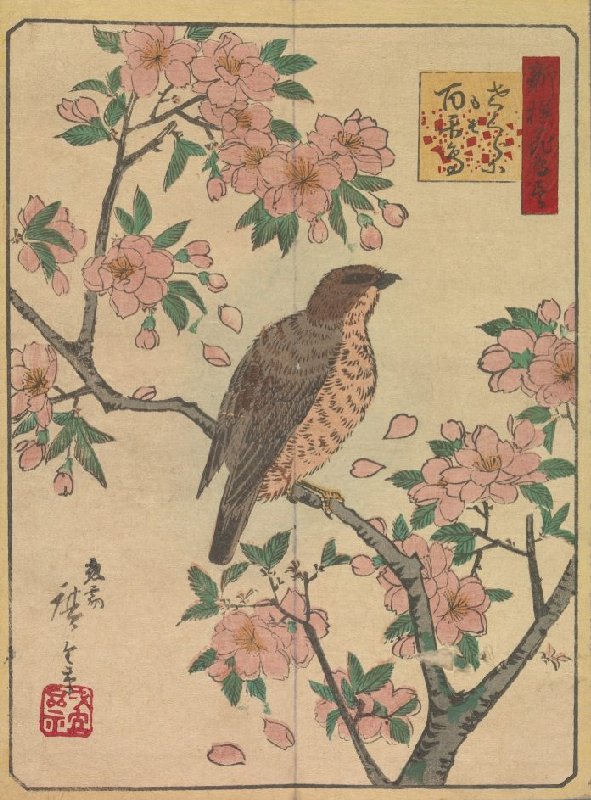 Kersenbloesems en klauwier, uit het album Nieuwe selectie van bloemen en vogels