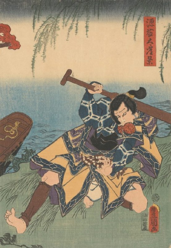 Acteur in de rol van Minamoto no Tōta Tsunekage, middenblad van triptiek Drie acteurs bij een boot