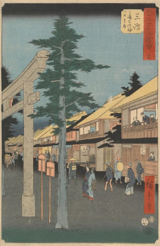Mishima: De eerste poort van de schrijn Mishima Daimyōjin, nr. 12 uit de prentenserie Verzameling afbeeldingen van beroemde plaatsen bij de drieënvijftig stations [langs de Tōkaidō]