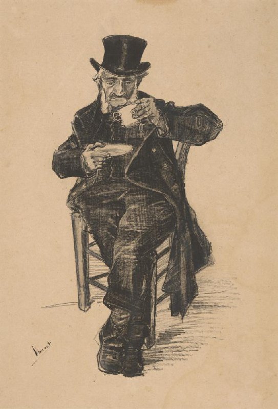 - 24 november 1882 door de kunstenaar vanuit Den Haag gezonden aan Anthon van Rappard, Utrecht; na zijn overlijden op 1 maart 1892 geërfd door zijn weduwe Henriëtte Elisabeth van Rappard-Del Campo, Santpoort; 1903 geschonken door Henriëtte Elisabeth van Rappard-Del Campo aan Philip de Kanter, Delft; 1926 verkocht door Philip de Kanter aan Kunstzaal d’Audretsch, Den Haag; na het overlijden van Herman Eduard d’Audretsch op 19 januari 1966 geërfd door zijn weduwe Margaretha Maria d’Audretsch-Krop, Amerongen; na haar overlijden op 6 december 1971 nagelaten aan haar erven; 9-10 mei 2023 veiling Leiden, Burgersdijk & Niermans (Books, Prints, Manuscripts), lot 951 (Pensioner drinking coffee), gekocht door Monique Hageman voor €275.880; bruikleen en toegezegde schenking aan het Van Gogh Museum, Amsterdam.
