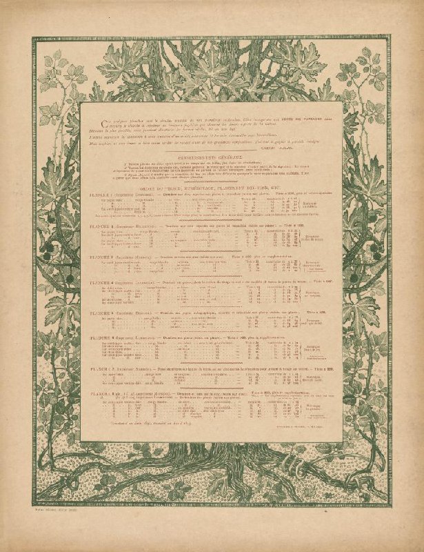 - Ces quelques planches sont le résultat modeste de mes premières recherches. Elles inaugurent une SUITE DE PAYSAGES dans lesquels je cherche à exprimer les émotions fugitives que donnent les divers aspects de la nature. Idéaliser le plus possible, sans pourtant dénaturer les formes réelles, tel est mon but. J'espère intéresser les amateurs à cette tentative d'un artiste convainen et les voir l'accueillir avec bienveillance. Mon confrère et ami Simas a bien voulu revêtir ce receuil d'une de ses gracieuses compositions: j'ai tou à gagner à parceille enseigne. ---------------------------------- Charles Dulac RENSEIGNEMENTS GÉNÉRAUX 1o Toutes pierres ou zines ayant servi à ce tirage ont été biffés, j'en tiens le attestations; 2o Toutes les épreuves de choix ont, comme garantie, la remarque et le numéro d'ordre suivi de la signature: les essais et épreuves de passe sont dépourvues de ces garanties ou portent un timbre annoçant leurs conditions; 3o Aywant chercé à rendre par la sensation du ton les effets très différents quoique la série en paraisse très multiple, il n'y a guère que deux effets très distincts dans chaque planche. ---------------------------------- ORDRE DU TIRAGE< NUMËROTAGE< CLASSEMENT DES TONS, ETC. [voor de rest van de tekst zie de reproductie]