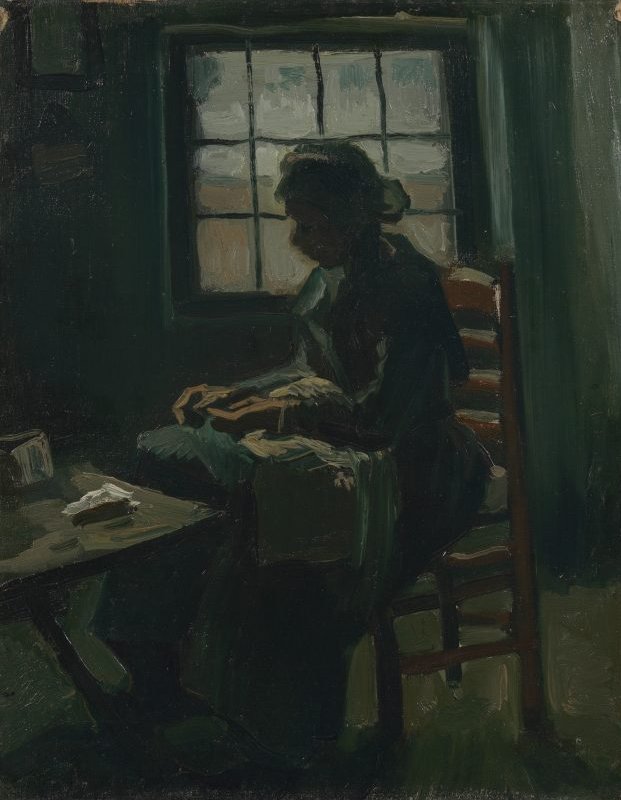 Hier probeerde hij een figuur in tegenlicht uit. Dat viel niet mee, schreef Vincent aan zijn broer Theo, ‘het is een moeielijk effekt’. Met de bijna zwarte kop van de vrouw en veel wit in de raampartij wist hij een sterk lichtcontrast te bereiken. Het binnenvallende licht concentreerde hij vooral op haar handen.