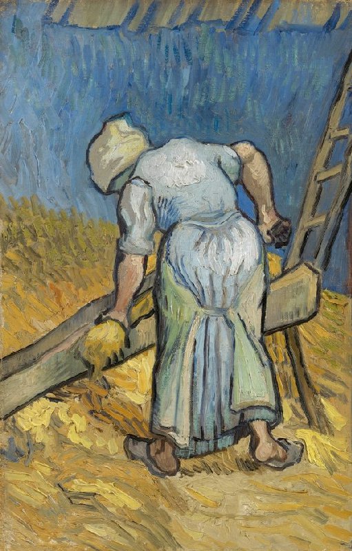 Met een afgewogen kleurpalet schilderde Van Gogh deze Vrouw die vlas kneust. Hij werkte niet naar een levend voorbeeld, maar naar een zwart-wit prent. Die kwam uit de serie Het werk op het veld, naar schilderijen van Jean-François Millet (1814-1875). Hij kopieerde ze allemaal.