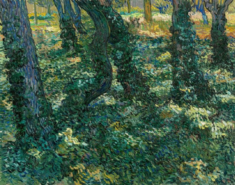 Zo op het eerste gezicht zie je hier inderdaad niet meer dan wat boomstammen met woekerende klimop en lichtvlekken op de grond. Maar als je inzoomt op dit schilderij zie je vooral een zee aan losse verfstreekjes. De meeste zijn kort en verrassend veelkleurig. Alleen de contouren van de boomstammen bestaan uit langere lijnen.