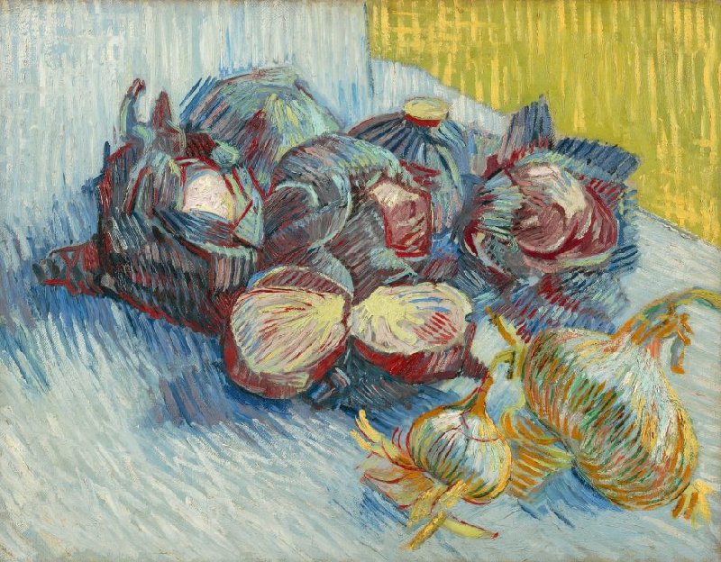 Een eenvoudiger onderwerp had Van Gogh niet kunnen kiezen: een paar rode kolen en knoflook. Maar op zijn zoektocht naar kleurcontrasten wist hij er toch iets bijzonders van te maken.