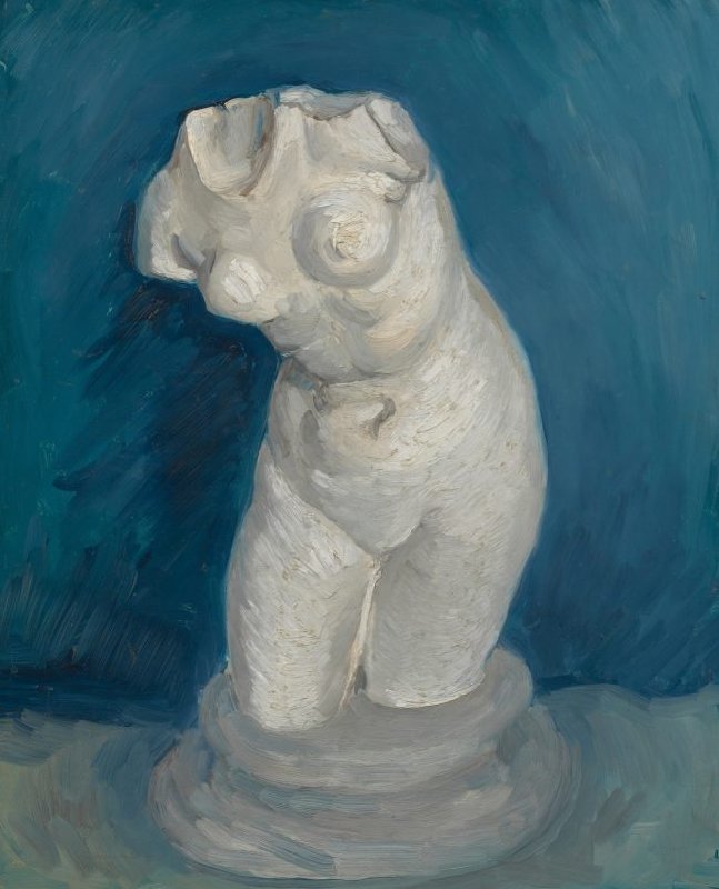 Oefenen en nog eens oefenen: in juni 1886 schilderde Van Gogh deze studie. Hij maakte deel uit van een hele reeks studies van gipsmodellen. Deze staande torso van Venus was blijkbaar zijn favoriet, want hij gebruikte hem maar liefst vijf keer als voorbeeld. Twee van die studies naar dit beeldje bevinden zich in de collectie van het Van Gogh Museum.