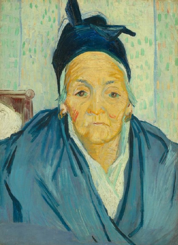 Van Gogh schilderde deze vrouw tijdens zijn verblijf in Hotel Carrel in het Zuid-Franse Arles. Het is hoogstwaarschijnlijk Elisabeth Garcin, de schoonmoeder van de hoteleigenaar. Zij was toen 68 jaar. De zwarte doek die ze om het hoofd heeft geknoopt, was de gebruikelijke dracht voor weduwes. Op de achtergrond is een deel van een bed te zien.