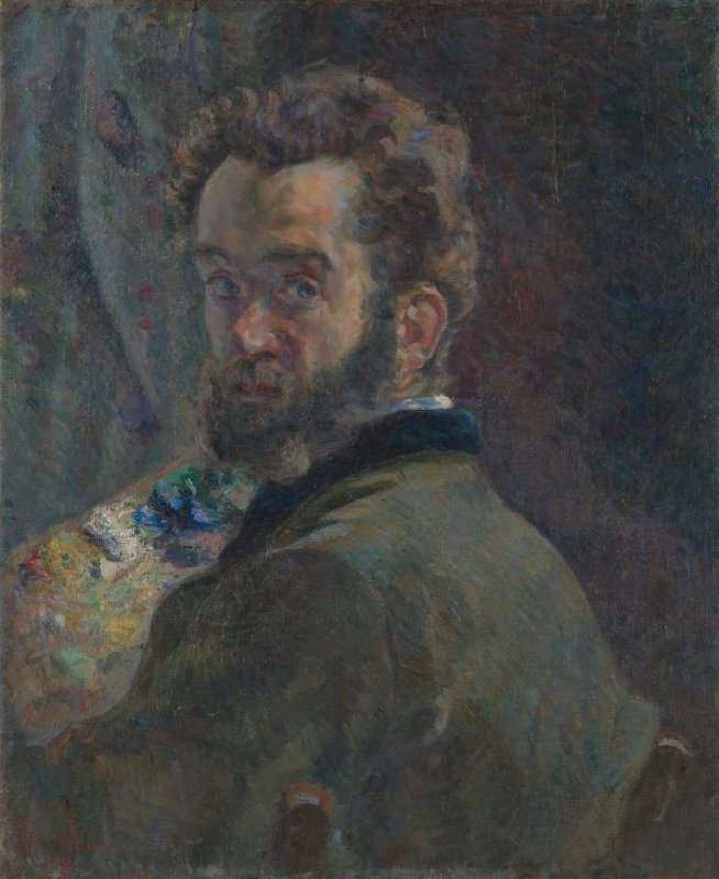 Dit zelfportret wekt de indruk dat je net het atelier van Guillaumin bent binnengestapt, die door jou uit zijn concentratie is gehaald en wat verstoord opkijkt. De blik wordt geleid naar de klodders verf op het palet, waarvan het rood, geel, groen en blauw terugkomen in het gezicht van de kunstenaar.
