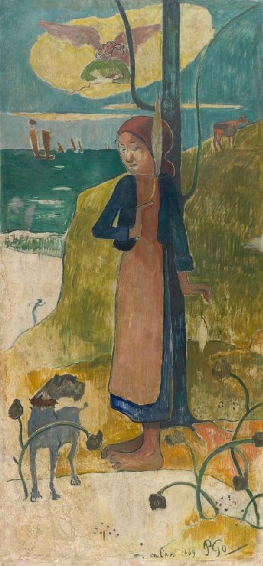 In een brief aan zijn vriend Van Gogh noemde Gauguin het meisje ‘een boerin’, die ‘aan het spinnen is aan zee’. (De spintol hangt aan haar hand, aan een nu bijna onzichtbare draad.) Hij beschreef hem alles, tot aan de koe in de achtergrond. Maar de engel boven het meisje noemde hij gek genoeg niet. We weten niet precies wat hij ermee bedoelde. Traditioneel werd zo Jeanne d’Arc uitgebeeld, aan wie de aartsengel Michaël verscheen.