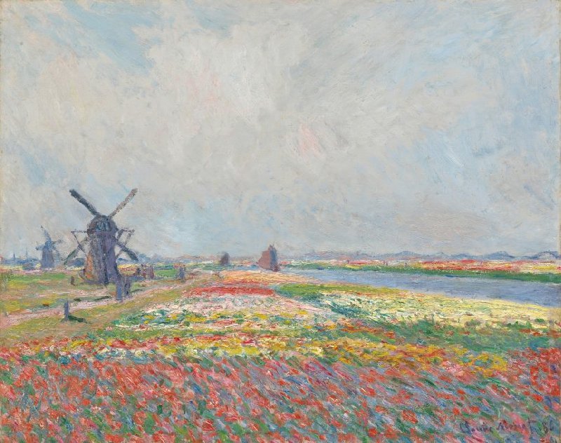 Monet was enorm onder de indruk van de kleurenpracht van de Hollandse bollenvelden. ‘Het is niet te doen met ons povere palet’, schreef hij in het voorjaar van 1886. Monet was vaker in Nederland geweest, maar schilderde deze bloemenzee nu voor het eerst. Eenmaal terug in Parijs, verkocht hij het schilderij via kunsthandel Boussod, Valadon & Cie, waar Theo van Gogh werkte.
