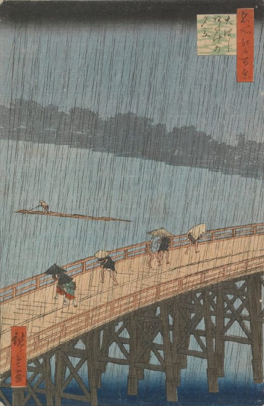 Onverwachte avondbui op de Grote brug bij Atake, uit de prentenserie Honderd gezichten op beroemde plaatsen in Edo