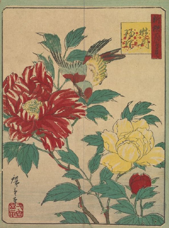 Pioenrozen en blauw-witte vliegenvanger, uit het album Niewe selectie van bloemen en vogels