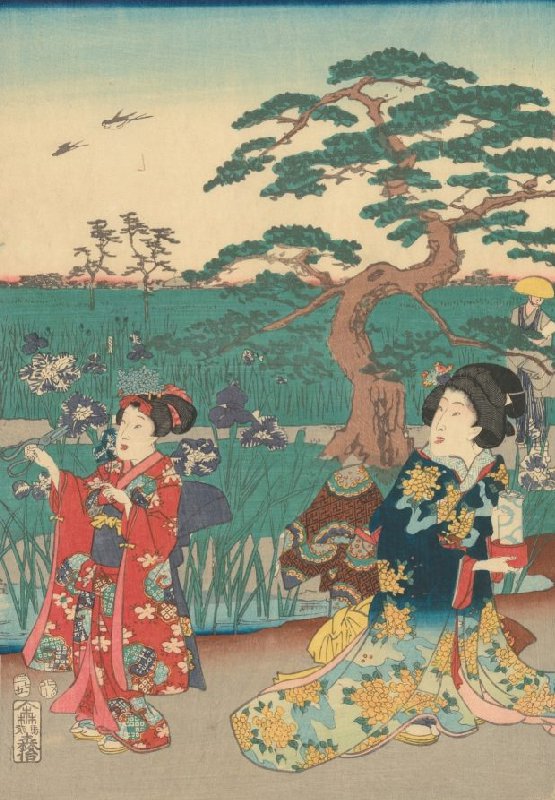Vrouw met theepot en dienstmeisje met schaar, middenblad van triptiek De iristuin bij Horikiri in de Oostelijke Hoofdstad