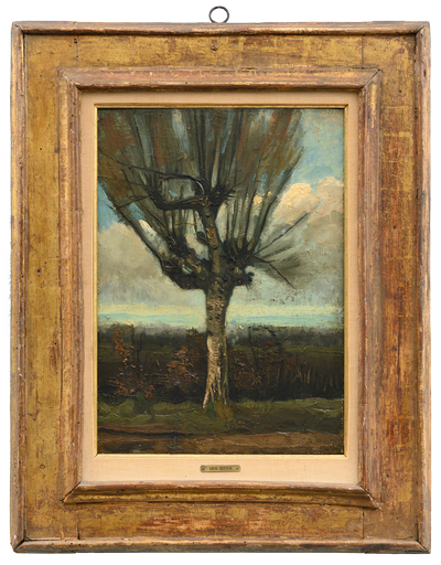 Dit charmante ‘portret’ van een knotberk schilderde Van Gogh in de herfst van 1884 ergens in de buurt van Nuenen. Het is een krachtig, rechttoe rechtaan gezicht op een karakteristiek gevormde boom langs de weg met daarachter wat struiken in herfsttooi. De lange, stakerige twijgen zitten nog in het blad en zijn klaar om geknot te worden.
