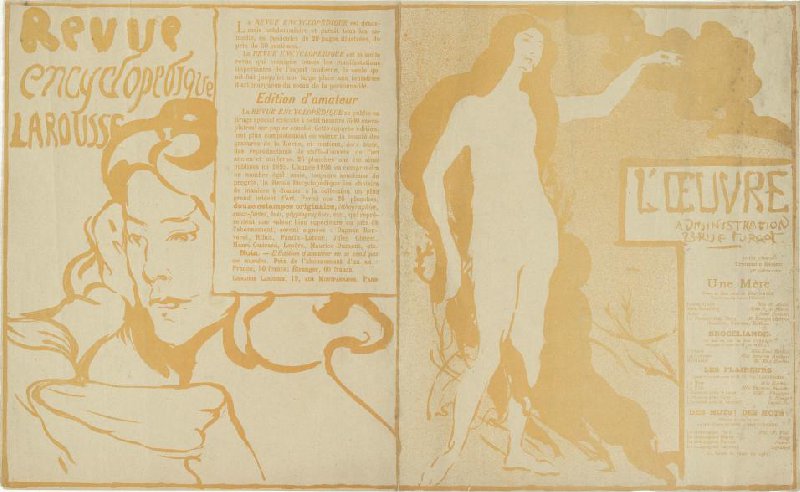 Theaterprogramma voor Une mère van Ellin Ameen, Brocéliande van Jean Lorrain, Les flaireurs van Charles van Lerberghe en Des mots, des mots van Charles Quinel en René Dubreuil (Théâtre de l'Oeuvre, 7 januari 1896) en een advertentie voor het tijdschrift Revue encyclopédique larousse