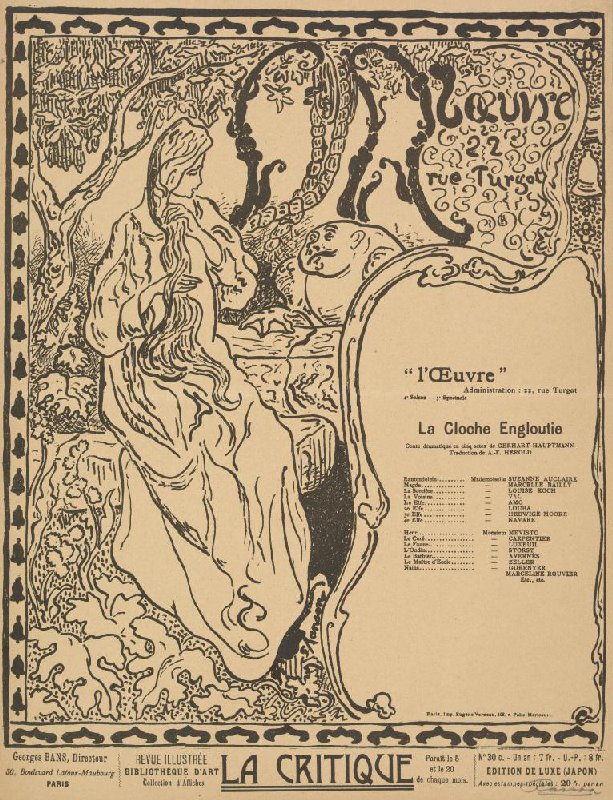 - "l'OEuvre" [adres] 4e Saison - 5e Spectacle La Cloche Engloutie Conte dramatique en cinq actes de GERHART HAUPTMANN [vertaler] [rolverdeling] Paris, Imp. Eugène Verneau, 106, r. Folie-Méricourt