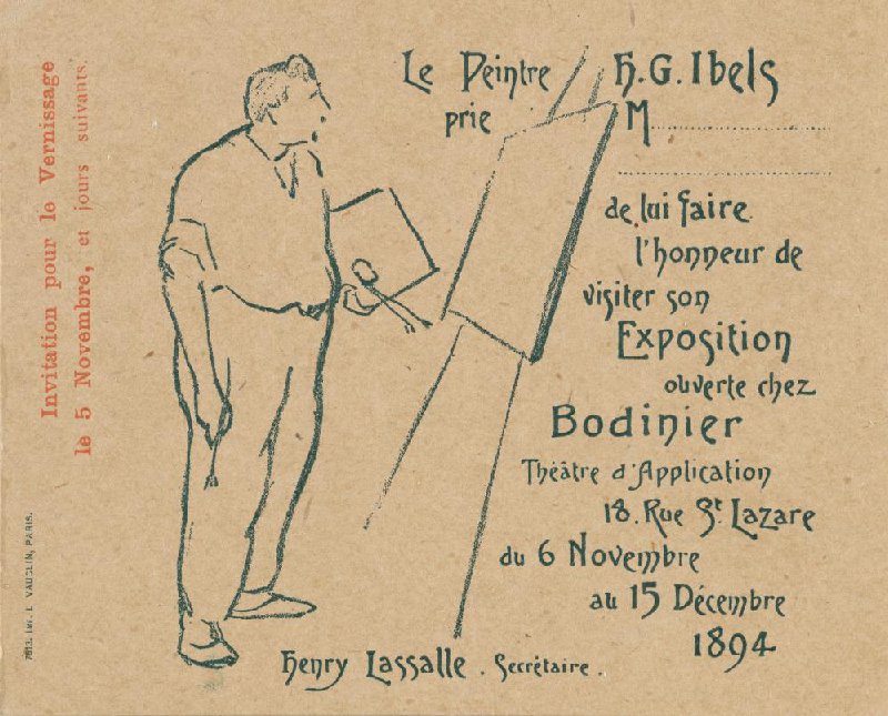 - Le Peintre H.G. Ibels prie M...................... ..................... de lui faire l'honneur de visiter son EXPOSITION ouverte chez BODINIER Théâtre d'Application 18. Rue St. Lazare du 6 Novembre au 15 Décembre 1894 Henry Lassalle. Secrétaire.