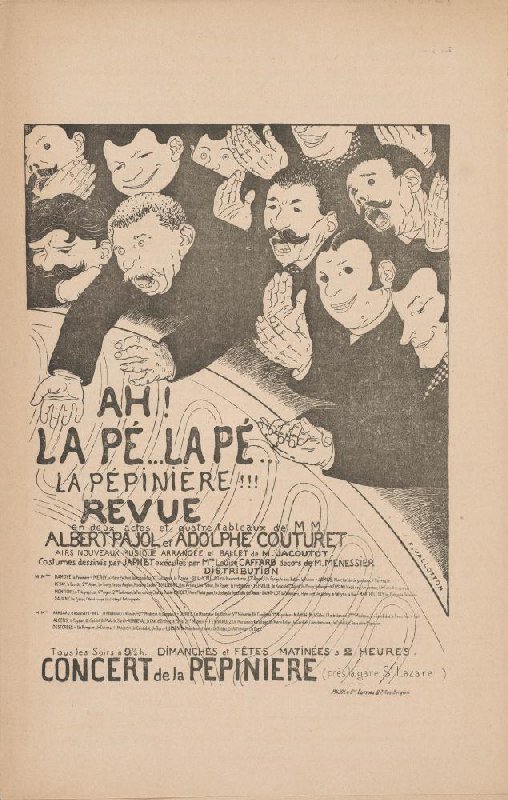 - AH! LA PÉ...LA PÉ... LA PÉPINIÈRE!!! REVUE en deux actes et quatre tableaux de M.M. ALBERT PAJOL et ADOLPHE COUTURET AIRS NOUVEAUX MUSIQUE ARRANGÉE ET BALLET DE M.JACOUTOT. Costumes dessinés par JAPHET exécutées par Mme Louise CAFFARB décors de M.MENESSIER DISTRIBUTION [namen acteurs, twee alinea's] Tous les soirs à 91/2h. DIMANCHES et FÊTES MATINÉES à 2 HEURES CONCERT DE LA PEPINIERE (près la gare St Lazare) PAJOL & Cie. Éditeurs. 27. Rue Bergère