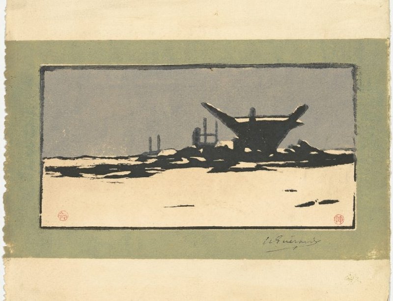 houtsnede in drie kleuren op aquarelpapier, 24.9 cm x 28.1 cm