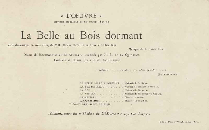 - << L'OEUVRE >> septième spectacle de la saison 1893-94 La Belle au Bois dormant Féerie dramatique en trois actes, de MM. Henri Bataille et Robert d'Humières Musique de Georges Hue [decorontwerpers en decorbouwer] [kostuumontwerpers] Mourir..... dormir..... rêver peut-être..... (Shakespeare) [rolverdeling] [adres] Édité par L'Estampe Originale, 17, rue de Rome
