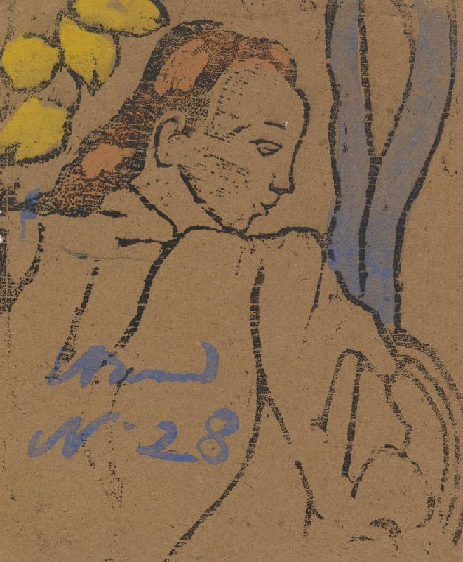 houtsnede in zwart, handmatig ingekleurd met waterverf, op bruin velijnpapier, 15.5 cm x 12.3 cm